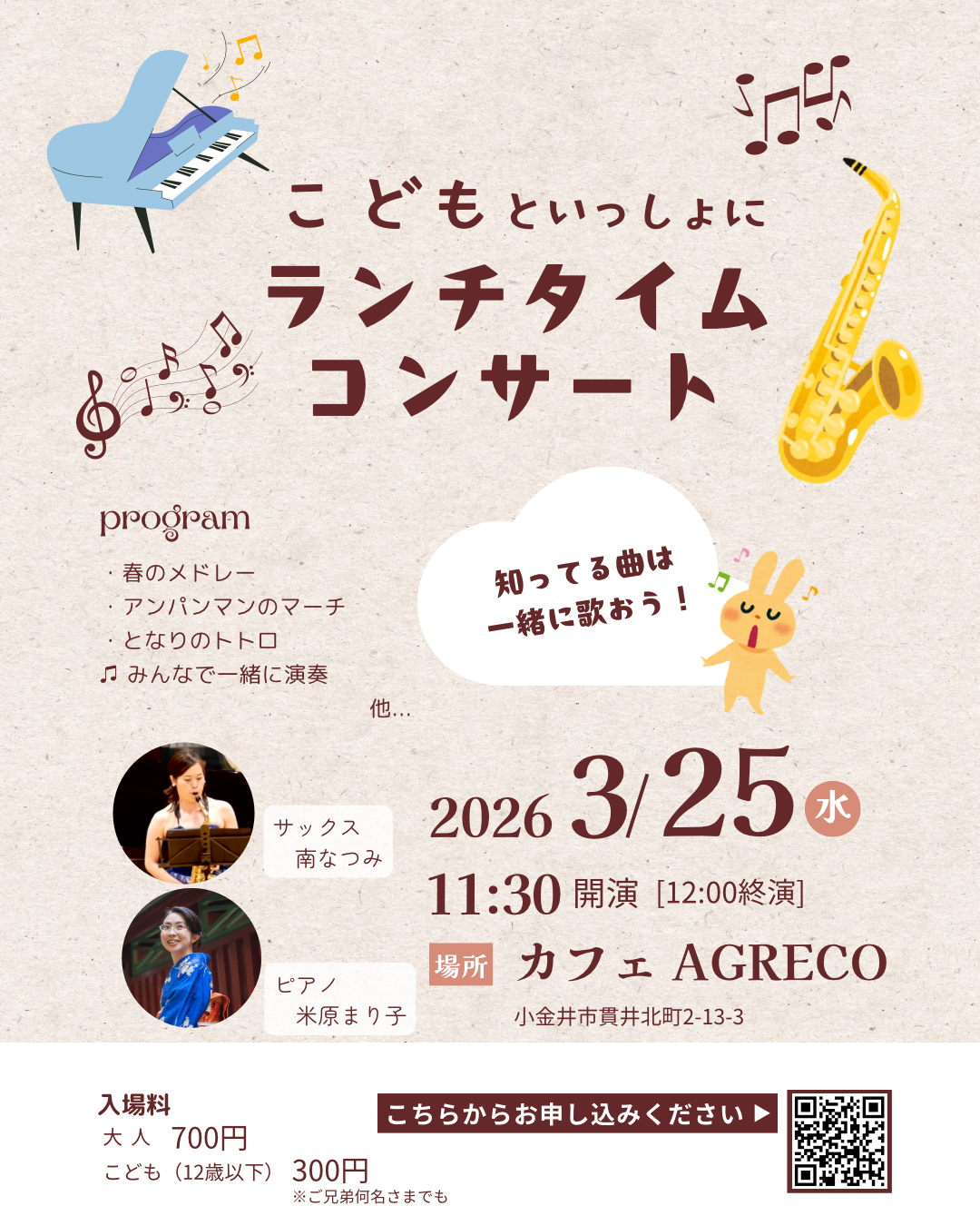 月1回の定期開催している「ランチタイムコンサート」が、ピアノとのアンサンブルでパワーアップ&親子(未就学児もOK)も楽しめるプログラムでお届けします!